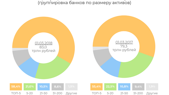 Активы банков РФ, раскрывавших отчетность, уменьшились за февраль 2018 года на 1%, или 830,2 млрд рублей, свидетельствуют данные финансового рейтинга Банки.ру. По информации, размещенной на сайте Банка России, банковский сектор в январе «потерял» 1 трлн рублей, или тот же 1% (с устранением влияния валютной переоценки), а совокупный объем активов на 1 февраля 2018 года составил 83 трлн рублей. В феврале Сбербанк показал рост активов и стал лидером по этому показателю (плюс 113 млрд рублей, или 0,5%, за месяц). За февраль активы увеличились только у трех крупнейших банков из десяти. Помимо Сбербанка это Россельхозбанк (рост на 38,2 млрд рублей, или 1,2%) и Бинбанк (рост на 13,8 млрд, или 1,1%). Отметим, что в топ-10 по активам на 1 марта 2018 года осталось только два банка, которые бы так или иначе не контролировались государством. С учетом такой динамики концентрация активов на крупнейших банках за месяц сократилась, чего нельзя сказать о периоде в 12 месяцев. По данным Банка России, на 1 марта 2018 года доля пяти крупнейших банков составляла 58,4% активов сектора (против 58,6% на 1 февраля 2018 года и 55,4% на 1 марта 2017 года), топ-20 формировали 79,4% (месяц назад — 79,7%, 12 месяцев назад — 77,9%), на топ-50 приходилось 89,9% (месяц назад — 90,1%, 12 месяцев назад — 88,7%), на топ-200 — уже 98,5% в общем объеме, как и месяц назад (12 месяцев назад — 98,1%). Пятерка лидеров по абсолютному увеличению нетто-активов поменялась за месяц кардинально. В феврале 2018 года наибольший прирост активов после Сбербанка показали банк «Россия» (плюс 68 млрд рублей, или 7,8%), ИНГ Банк (плюс 53,8 млрд, или 24,7%), РСХБ и Росбанк (плюс 34,2 млрд рублей, или 3,7%). Напомним, в январе лидерами по приросту активов были ВТБ, Газпромбанк, НКО «Национальный Клиринговый Центр», Райффайзенбанк и Московский Кредитный Банк. Отрицательную динамику активов в феврале продемонстрировали в общей сложности 308 кредитных организаций из 551 имеющей право на осуществление банковских операций. Крупнейшее сокращение показал Газпромбанк (на 406,5 млрд, или 6,7%), обогнав уже не санируемый официально банк «ФК Открытие» (сокращение на 169,1 млрд, или 7,3%). Также в пятерку по сокращению активов за февраль попали Московский Кредитный Банк (минус 142,3 млрд, или 7,2%), НКО «Национальный Клиринговый Центр» (минус 140,4 млрд, или 4,7%) и ВТБ (минус 139,9 млрд рублей, или 1,1%). В большинстве случаев основной причиной отрицательной динамики чистых активов стало сокращение объема средств на текущих счетах и депозитах корпоративных клиентов. Только у «Открытия» и МКБ причины иные: первый вернул свыше 180 млрд рублей кредитов, привлеченных у Центробанка, а второй более чем на 100 млрд рублей сократил объемы межбанковских кредитов, привлеченных от банков-резидентов.