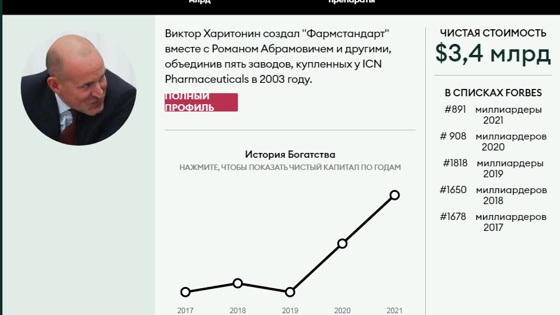 Как говорится в профиле бизнесмена, Виктор Харитонин создал «Фармстандарт» вместе с Романом Абрамовичем и другими, объединив пять заводов, купленных у ICN Pharmaceuticals в 2003 году. В 2016 году господин Харитонин и его партнер Егор Кульков взяли компанию в частные руки, выкупив акции и сделав делистинг с Лондонской фондовой биржи.