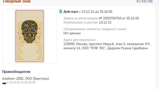 Согласно данным СБИС, товарный знак в виде черепа, орнаментированного в латиноамериканском или индейском стиле, предназначен для нескольких десятков разновидностей спиртных напитков. В перечне значится как крепкий алкоголь, так и относительно слабые его разновидности.