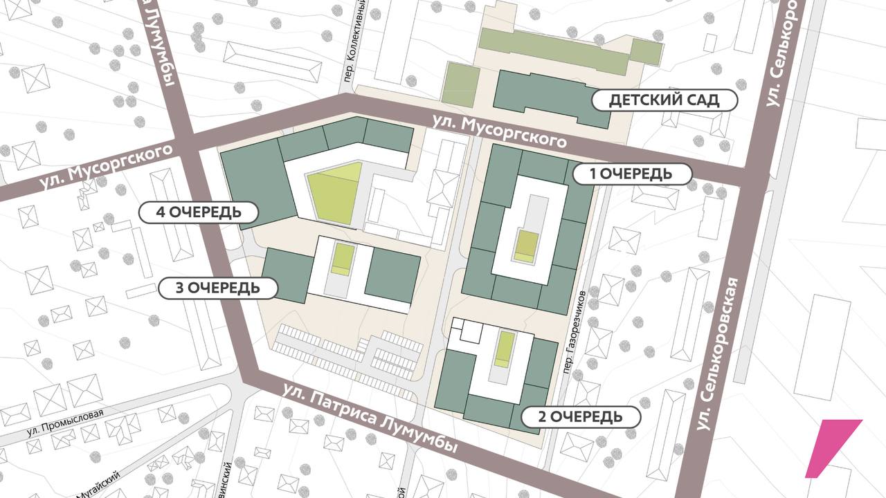 Первая очередь строительства включает около 24 000 кв. м жилой недвижимости для 600 человек. Старт работ запланирован на конец сентября. «Практика» взяла на себя все расходы по расселению жителей из старых домов. Подготовка участка под первую очередь уже завершена.
