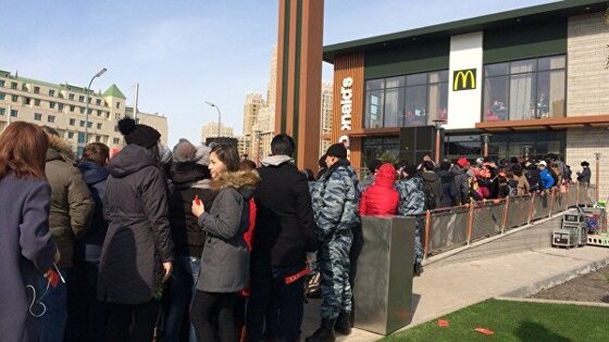 Открытие первого в Казахстане ресторана быстрого питания американской сети McDonald's состоялось во вторник в городе Астане, передает корреспондент агентства РИА Новости. Ресторан расположился в престижном районе столицы — на пересечении проспекта Кабанбай батыра и улицы Сарайшык. Он занимает площадь более 860 квадратных метров и предоставляет для посетителей 206 посадочных мест. Инвестиции в первый ресторан составили 3,5 миллиона долларов. По информации корреспондента РИА Новости, на открытие заведения в этот ветреный день собралось около 200 человек — в основном дети и молодежь. Обстановка сложилась спокойная, за соблюдением порядка наблюдали полицейские и охранники. На площадке перед рестораном были выставлены ограждения, во избежание давки внутрь здания людей пускали небольшими группами. Организаторы мероприятия развлекали ожидающих танцами и конкурсами. Как рассказала РИА Новости ученица седьмого класса одной из близлежащих школ Томирис, она с подругами стоит в очереди около часа. " McDonald's — популярная компания, поэтому захотелось прийти. Узнали про открытие из социальных сетей. Стоим, чтобы первыми попробовать и выложить фото в Instagram", — сказала она. Лесника Жаркына на открытие привели дочери, а он не смог отказать им в Международный женский день 8 марта. «Об открытии рассказали дочки. Потом тоже будем приходить», — добавил 49-летний мужчина. Пятидесятилетняя школьная учительница биологии и химии Зульпаш стоит в очереди около двух часов. «Здесь рядом живу, работаю, поэтому знаю про открытие. Хочу первой попробовать», — отметила она.