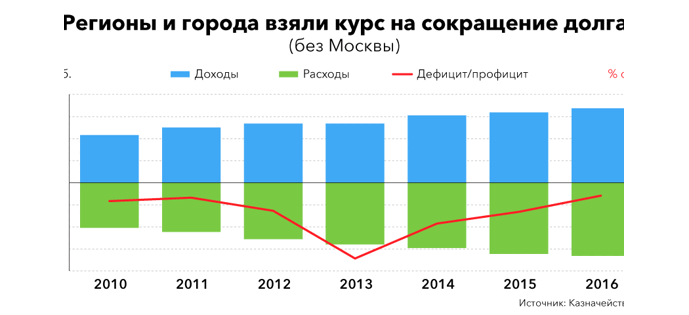 По подсчётам аналитиков агентства Fitch, медианный дефицит по субъектам России в 2016 году составил 2,6% от доходов по сравнению с 6,1% в 2015 году. Тенденция сокращения бюджетных дефицитов во многом связана с ужесточением требований федеральных властей к формированию бюджетов регионов и курсом на сдерживание расходов со стороны местных властей. В 2016 году впервые за многие годы показатели региональных дефицитов по бюджетам оказались лучше, чем ожидалось, констатирует старший директор по международным региональным финансам Fitch Владимир Редькин: на фоне улучшения ситуации в экономике идёт восстановление региональных финансовых показателей. Среди главных факторов ухудшения показателей региональных бюджетов — увеличение поступлений за счёт акцизов и налогов на прибыль от финансового сектора. Многие субъекты федерации продемонстрировали хороший контроль над расходами в прошлом году, отмечает Редькин. В то же время ситуация в регионах сильно разнится: около четверти регионов имеют долг менее 30% от доходов, что является с точки зрения Fitch приемлемым показателем. Однако в нескольких субъектах федерации (Хакасии, Мордовии, а так же Костромской, Астраханской и Смоленской областях) долг превышает отметку 80% годовых доходов бюджета. Наибольший бюджетный дефицит по итогам 2016 года зафиксирован в республике Хакасия, наибольший профицит — в Тверской области. Прямой долг субъектов Федерации в 2016 году вырос на 50 млрд рублей и приблизился к 2,3 трлн рублей. По подсчётам Fitch, прирост долга обеспечили бюджетные кредиты (+181 млрд рублей): их доля выросла с 37% до 44% в 2016 году. Бюджетные кредиты в прошлом году стали главным инструментом финансирования, отодвинув на второе место кредиты банков, доля которых снизилась с 42% до 36%. Таким образом структура долга улучшается, указывает Fitch: банковские кредиты в абсолютном выражении сократились на 125,5 млрд рублей, финансирование за счёт облигационных выпусков практически не изменилось (-7,7 млрд рублей) Анализ динамики показателей региональных бюджетов показывает, что рост долговой нагрузки снижается уже третий год подряд. В 2016 году прирост долга субъектов Федерации составил 3% — рекордно низкое значение в абсолютном выражении. Среди факторов риска для региональных бюджетов Fitch указывает общее давление на бюджетную систему страны, стагнирующие налоговые доходы на фоне слабого восстановления экономики и риск рефинансирования, связанных коротким профилем погашения долга. Возможен откат показателей по налоговым доходам, прогнозируют в Fitch. Ещё один фактор риска — политический. Смогут ли регионы сохранить тренд на сдерживание бюджетных расходов в предвыборный год — это вопрос, предупреждает Редькин. Среди долгосрочных рисков для региональных финансов Fitch указывает возможность сокращения бюджетных кредитов и высокую централизацию принятия решений на федеральном уровне, а также риск повышения расходов на обслуживание долга.