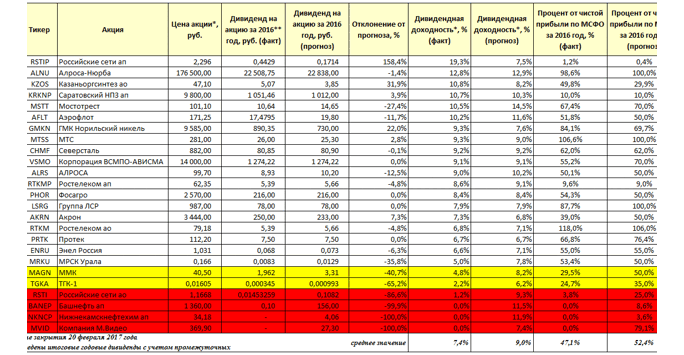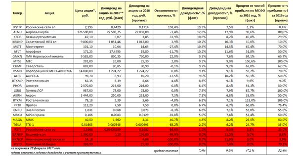 К началу лета практически во всех российских компаниях прошли заседания советов директоров и стали известны итоговые годовые дивидендные выплаты. Теперь рекомендованные дивиденды нужно утвердить на собраниях акционеров. Хочу заметить, что дивиденды не являются окончательными и будут выплачены только после утверждения собранием акционеров, к примеру, в Селигдаре и Донском заводе радиодеталей (ДЗРД) акционеры регулярно голосуют против рекомендаций совета директоров. Любопытно подвести итоги дивидендный весны и ее с прогнозами (см. Дивидендный урожай 2017: акции каких компаний) Работа над ошибками В конце февраля текущего года подготовлен прогноз дивидендов по итогам 2016 года. Его сложность заключается в двух аспектах: во-первых, размер непосредственно чистой прибыли, который согласно последним веяниям и появлению понятия «бумажной прибыли» стал малопрогнозируемым. К тому же некоторые компании применяют различные поправки на «целевую прибыль», которая должна быть задействована впоследствии определенным образом (плата за техническое присоединение у электросетевых компаний, специальная надбавка у облгазов). И во-вторых, доля прибыли, которую компания распределит в виде дивидендов. Решение этих нетривиальных задач и приводит к точному прогнозу размера дивидендов. Среднее значение дивидендной доходности выбранных акций оказалось 7,4% против прогнозного значения 9%, что является неплохим результатом. Главной провальной дивидендной идей года можно назвать – обыкновенные акции «Россетей», но большее удивление вызывают крупные дивиденды на привилегированные акции, как самого холдинга, так и на привилегированные акции или «префы» ее «дочки» – «Ленэнерго». На днях уже прошло собрание акционеров, где были утверждены крупные выплаты. Странность всей ситуации заключается в том, что у «Ленэнерго» в уставе нет условия пропорциональности выплат на «префы в зависимости от их доли в уставном капитале. Допущена смысловая ошибка, обычно норма расчета дивидендов по «префам» – это 10% от чистой прибыли (ЧП) на долю 25% от уставного капитала. У «Ленэнерго», как и «Россетей», проводивших неоднократно дополнительные эмиссии обыкновенных акций доля привилегированных акций в уставном капитале составляет лишь 1%. Получается, что владельцы «префов» «Ленэнерго» участвуя в капитале лишь на 1% – имеют право на дивиденд в 10% от чистой прибыли. Если бы условие пропорциональности действовало в уставе, то доля прибыли, приходящиеся на дивиденды должна была быть не более 0,4%. Эта ошибка ущемляет интересы владельцев обыкновенных акций «Ленэнерго» (то есть «Россетей» и, в конечном счете, государства), но ее легко устранить – для этого акционерам достаточно просто не принять решение о выплате дивидендов по «префам» (см. Конституционный суд разрешил нарушать устав в части выплат по привилегированным акциям) Ответом о причинах странного поведения чиновников Росимущества, курирующих холдинг «Россети», незамечающих явное нарушение интересов государства, как собственника, стало бы раскрытие списка владельцев привилегированных акций «Ленэнерго» и выявление скрытого интереса определенных лиц. Между тем, в другой государственной дочке, входящей в Группу «Газпром», происходит прямо противоположное. По уставу «Газпром газораспределение Ростов-на-Дон