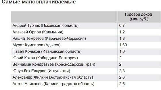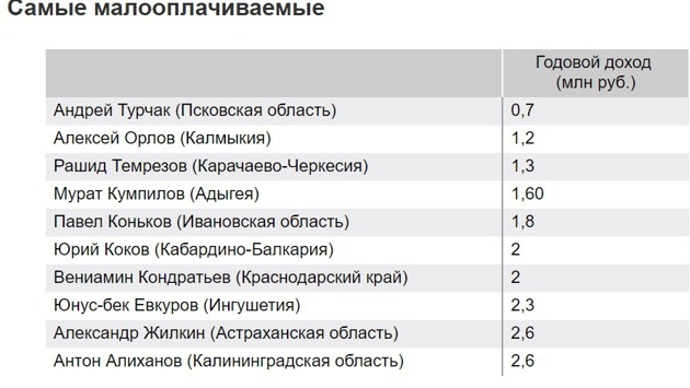 «КоммерсантЪ. Власть» подвел итоги очередной декларационной кампании глав российских регионов, опубликовав рейтинг доходов губернаторов и их супругов: по данным издания, губернатор Псковской области Андрей Турчак заработал в 2016 году меньше всех среди руководителей регионов России.По традиционно рассчитываемому «Властью» коэффициенту близости к народу (процентное отношение среднего дохода по региону к доходу главы региона) Андрей Турчак также оказался самым близким к народу - с коэффициентом 35,82%. Вновь вошли в рейтинг близости к народу Роман Копин, Алексей Орлов, Рашид Темрезов и Наталья Комарова.При этом жена Андрея Турчака Кира заняла 6 место среди супругов глав регионов. Как отмечает «КоммерсантЪ. Власть», Кира Турчак стала единственной, кто сохранил место в топ-10 самых обеспеченных супругов глав регионов.Напомним, в марте 2015 года после того, как президент России Владимир Путин сократил себе зарплату на 10 процентов, Андрей Турчак урезал свою заработную плату сразу на 50 процентов. «Это моё собственное решение», - уточнил Турчак в ходе своего заявления.