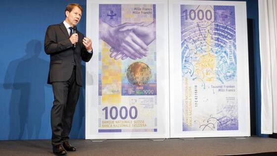 Швейцарский национальный банк (SNB) представил купюру в 1000 франков нового образца. Банкнота станет самой дорогой в Европе и второй по ценности в мире – после купюры в 10 тысяч брунейских долларов, сообщает "Интерфакс".