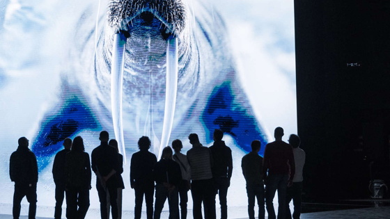 В одной из сцен инсталляции из ее изогнутого экрана буквально выплывает гигантский восьмиметровый морж. Оптическую иллюзию создает технология 3D Naked Eye, позволяющая видеть объемные изображения без специальных очков. Вслед за моржом также появляется огромный кит в сопровождении стаи рыб и проплывает занесенный в Красную книгу морской единорог – нарвал.
