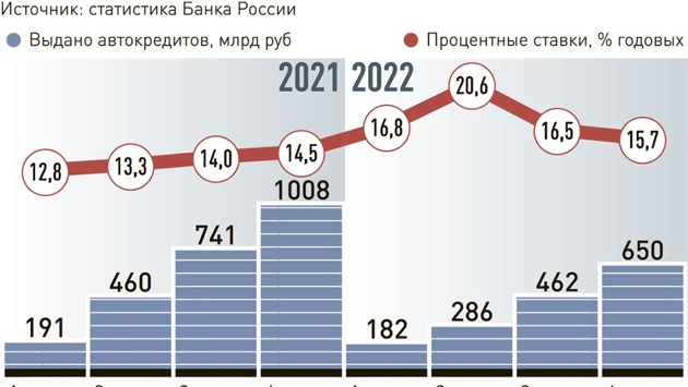По данным Банка России, в прошлом году портфель автокредитов снизился на 3,7%, или на 47 млрд рублей, а выдачи сократились на 36%. В целом продажи автомобилей сократились на 58,8%, или на 979 тысяч штук, по сравнению с 2021 годом.