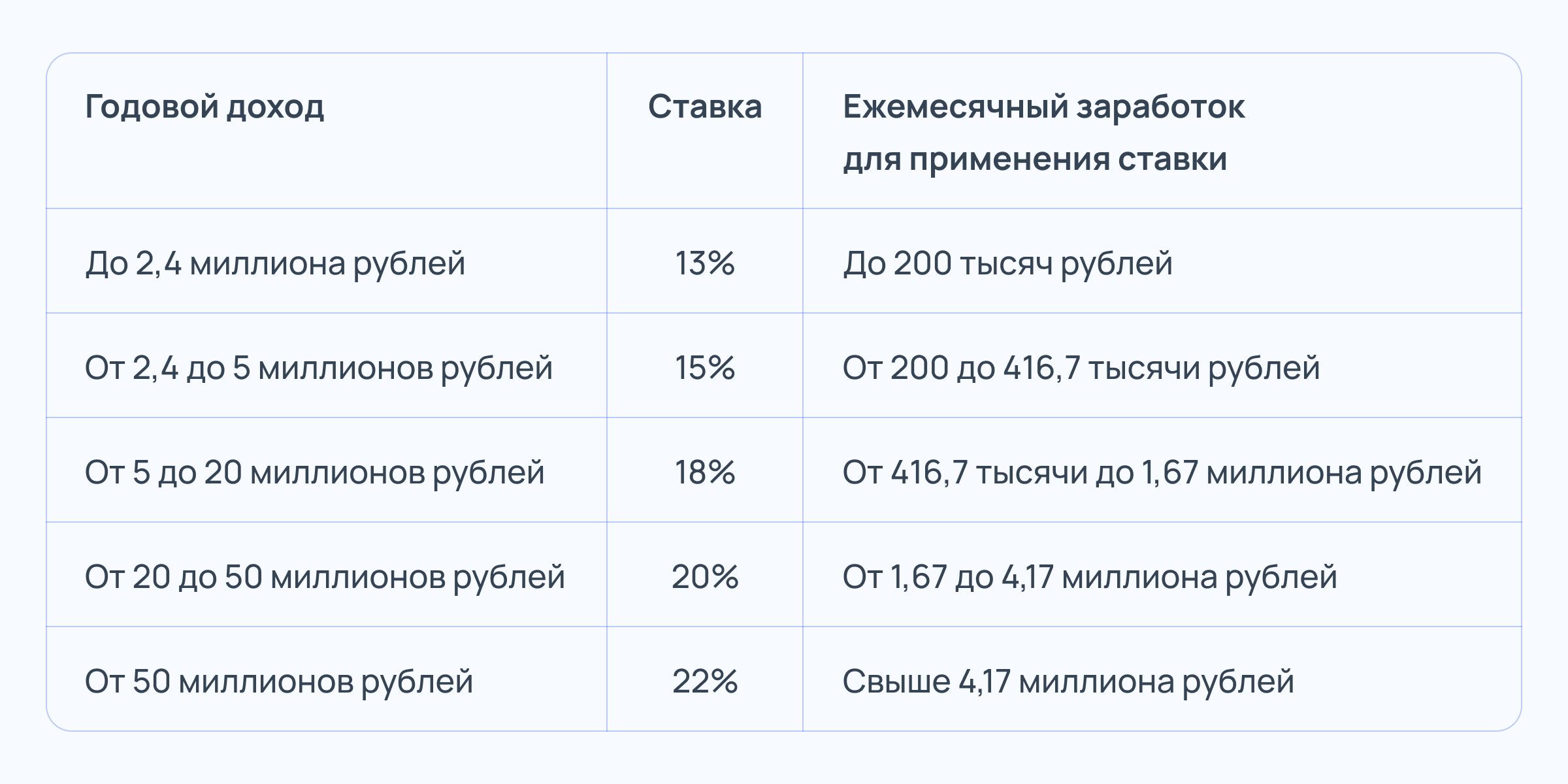 До 2025 года налоги с доходов граждан взимали по двум ставкам — 13 и 15%. Вторую использовали, если человек зарабатывал больше 5 миллионов рублей в год. С 2025 года градацию расширили — теперь она включает 5 ступеней. Ставки составляют от 13 до 22% и зависят от годового дохода налогоплательщика: