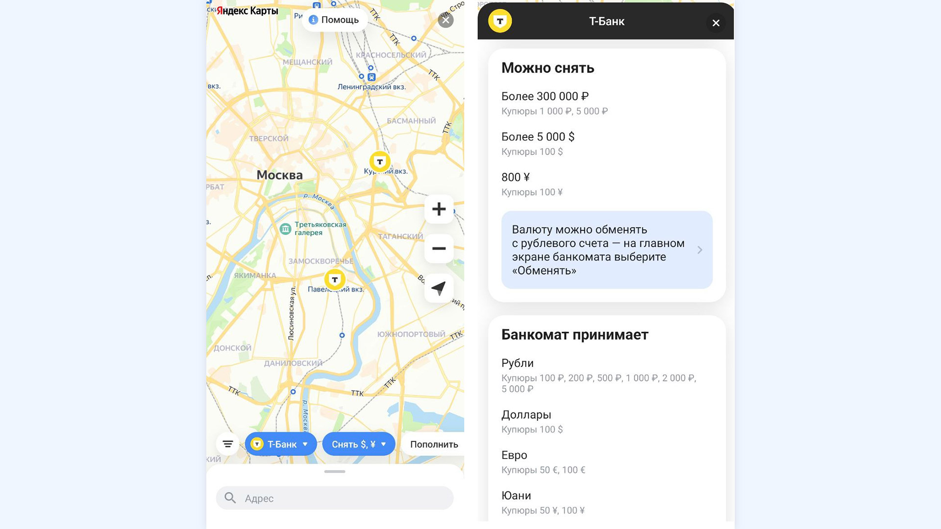 В 2025 году в мегаполисах можно найти банкоматы крупных банков с функцией обмена валюты. Больше всего таких терминалов у Т-Банка. На начало ноября в них можно снять доллары, евро, юани, баты и дирхамы со списанием с рублёвого счёта.