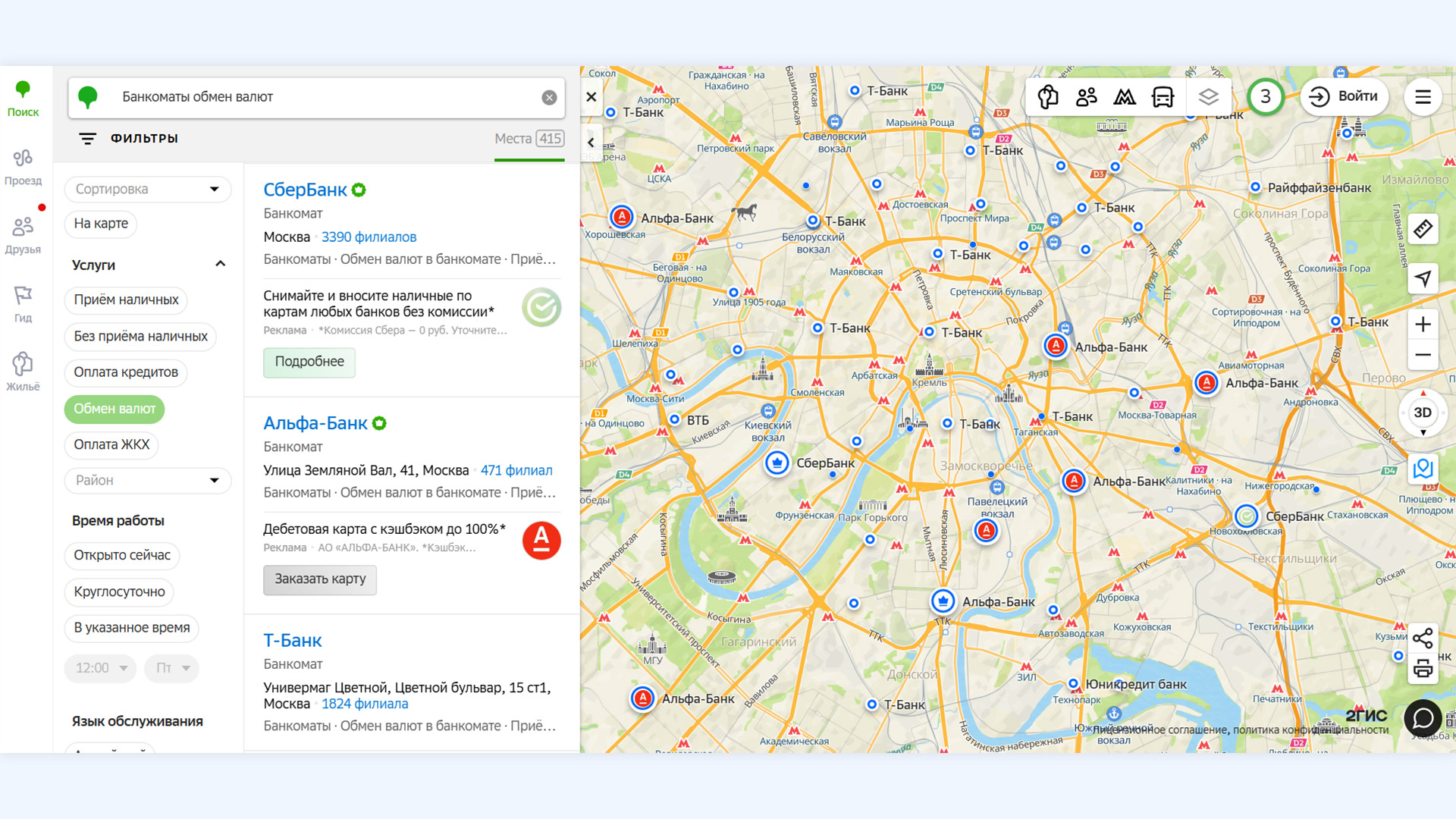 Функцию обмена валюты также поддерживают некоторые банкоматы Газпромбанка, Альфа-Банка, Сбера. Найти терминалы можно через 2ГИС по запросу «банкоматы обмен валюты».