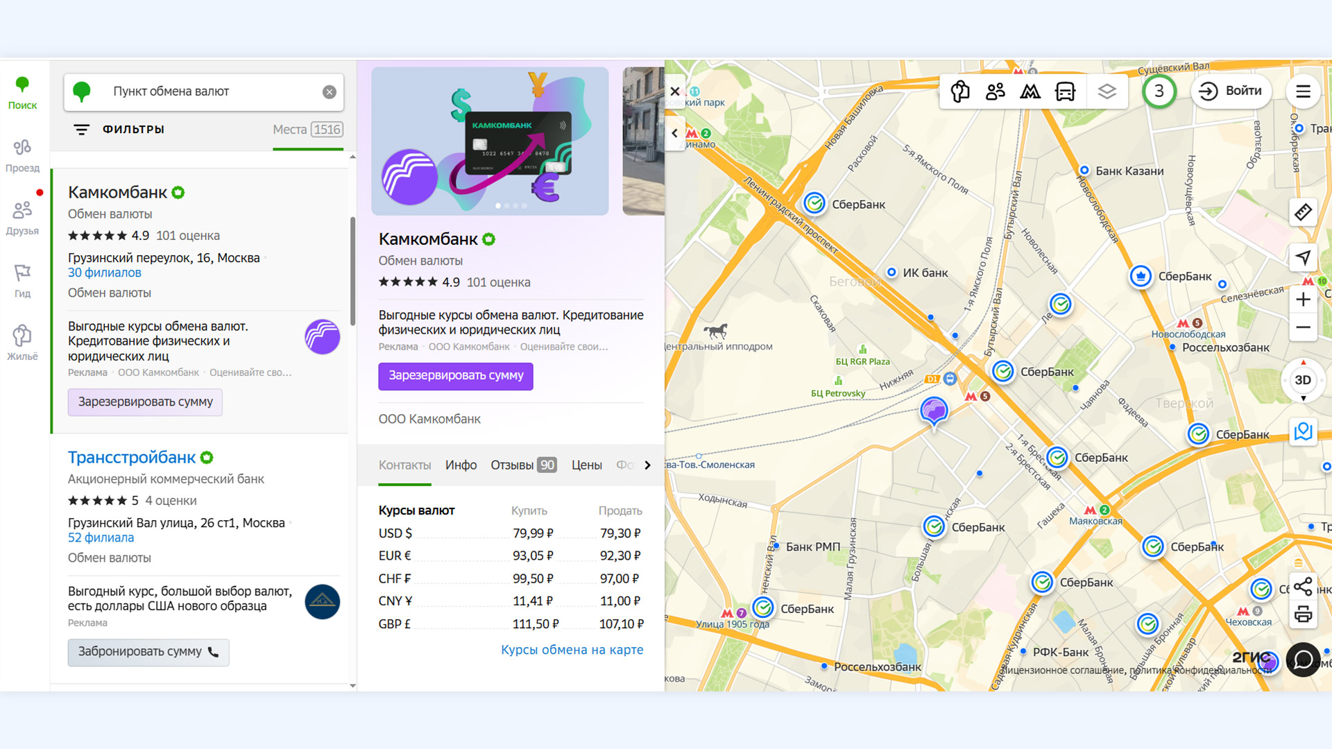 В Москве продаются доллары, евро, юани, фунты, дирхамы, белорусские рубли, турецкие лиры, казахстанские тенге, грузинские лари и другие валюты. Найти отделение с нужной валютой, проверить курс и зарезервировать нужную сумму можно через 2ГИС.
