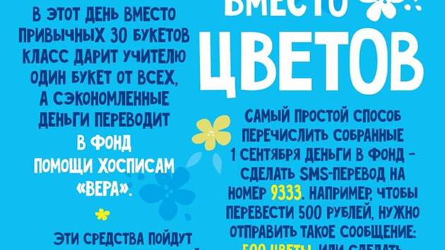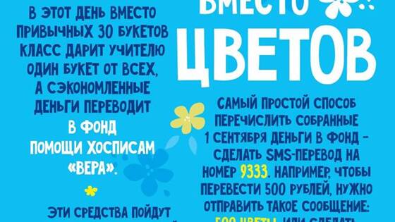 Вместо покупки цветов родителям предлагается перевести деньги для больных детей 1 сентября в школе № 14 района Тропарево-Никулино пройдет акция «Дети вместо цветов». Ее смысл состоит в том, что класс покупает учителю лишь один букет цветов, а сумму, равную стоимости остальных цветов, которые купили бы родители, можно перевести в поддержку больных детей, подопечных программы фонда «Вера» и детского хосписа «Дом с маяком». Виктория Васильева Фото: http://sch14.mskobr.ru/