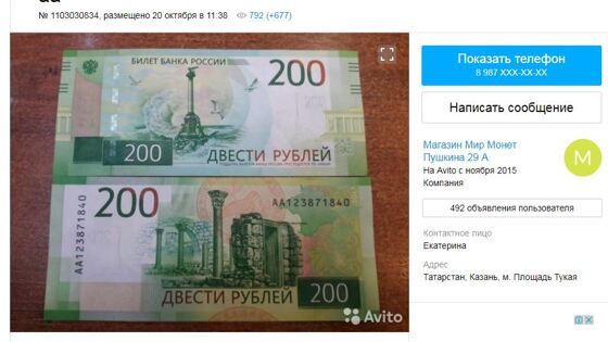 Ссылка на лот. Пока банкноты номиналом 200 и 2 000 рублей появились только в Москве и регионах, которые на них изображены – Крым и Дальний Восток (2 000 рублей). Планируется, что по всей России купюры разойдутся в декабре. Казань участвовала в голосовании за город, который должен был быть изображен на валюте. Ранее сообщалось, что спекулянты во Владивостоке продовали новые купюры дороже номинала на 500-600 рублей. Объявления были также размещены в интернете.