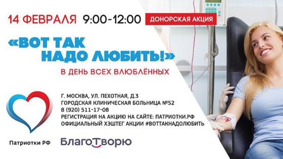 Общественная организация «Патриотки России» призвали москвичей и гостей столицы принять участие в благотворительной акции «Вот так надо любить!», сдав кровь в отделении переливания крови Городской клинической больницы № 52. По словам активисток, акция проходит как напоминание о том, как нужно любить по-настоящему. Акт дачи крови — это доброе дело, которое отличает человека, любящего своих сограждан, и понимающего, что переливание крови спасает жизни миллионов человек во всем мире. Дав кровь всего четыре раза за год, ты спасаешь жизни 12 человек. Не оставайся в стороне и присоединяйся к нам в этот замечательный день!призвали участницы организации. Председатель «Патриоток России» Галина Ржаксенская подчеркивает, что своей акцией организация хочет популяризировать донорство: «На сегодняшний день в России не хватает доноров, поэтому часто в больницах нет крови для переливания, из-за чего близким пациентов приходится самостоятельно искать людей, которые могут дать кровь». Красивые, здоровые и ответственные девушки — что может быть лучше для того, чтобы обратить внимание общества на социально значимую проблему! Мы надеемся, что после того, как акция «Вот так надо любить!» получит достойную огласку, тысячи людей по всей стране задумаются о том, чтобы стать донорами крови и помочь другим людям,утверждает общественница. Заведующая отделением переливания крови больницы № 52 ДЗМ Оксана Карпова напоминает, что донорская кровь ежедневно требуется для лечения тяжелобольных людей, а иногда является единственно возможным путем к спасению их жизни: Донор — главный герой нашего отделения, потому что это люди, решившиеся на очень достойное и благородное дело, и им у нас всегда почет! Те доноры, которые у нас уже побывали, имели шанс в этом убедиться. Мы стараемся создать такую атмосферу в отделении, чтобы все понимали, что быть донором — безопасно, полезно и ответственно. Для тех участников благотворительной акции, кто будет сдавать кровь впервые, «Патриотки России» подготовили наглядную памятку донора: Не стоит забывать, что поучаствовавший в акции донор получает официальную справку, которая позволяет не ходить на работу в день дачи крови и прибавляет один день к отпуску. Для участия в акции необходима предварительная онлайн-регистрация. Общественная организация «Патриотки России» — это патриотическая организация девушек, публично осуществляющая социально значимые проекты. Их цель — сделать искреннюю заботу о своей стране и обществе модным и престижным занятием. Девиз организации: «Люби Россию делом!»