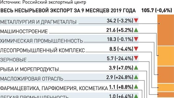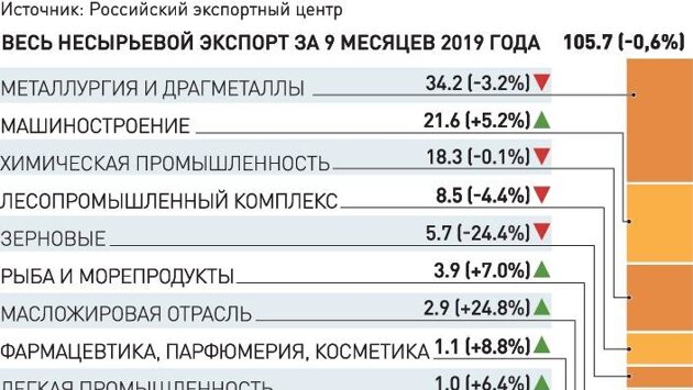ИНФОГРАФИКА "РГ" / АЛЕКСАНДР ЧИСТОВ / ИГОРЬ ЗУБКОВ Однако 2019 год стал не самым простым для российской внешней торговли вследствие "негативной конъюнктуры, торговых войн и протекционистских мер ряда стран", отмечает гендиректор Российского экспортного центра (РЭЦ) Андрей Слепнев. "Физические объемы экспорта показывают небольшой рост. И этот год показателен с точки зрения диверсификации торговли, - говорит он. - Большой вклад в рост ННЭ внесло машиностроение, в том числе поставки легковых машин. Серьезно вырос экспорт масложировой продукции, минеральных удобрений, химической продукции, пищевой и перерабатывающей отрасли". В 2018-м объем несырьевого экспорта достиг рекорда -150 млрд долларов, показав рост в 12%. План на 2019 год - 160 млрд, однако объемы останутся примерно на уровне прошлого года. Эксперты указывали на возможность роста на 2%, но если судить по результатам трех кварталов, даже такой результат все еще под вопросом, считает директор Института международной экономики и финансов Всероссийской академии внешней торговли Александр Кнобель. Основными причинами стала рыночная конъюнктура - прежде всего, падение цен на сталь, цветные металлы, продукцию деревообработки, - нетарифные барьеры, динамика курсов валют. "У некоторых товаров, которые занимают в структуре несырьевого экспорта значительную долю, ограничены возможности по наращиванию стоимостных объемов. Так, размер экспортной выручки от продажи черных и цветных металлов зависит от ценовой конъюнктуры на мировых рынках. В 2017-2018 годах цены росли - росла и экспортная прибыль российских металлургов. Сейчас рост цен прекратился - мы видим и стагнацию выручки. Сильная зависимость от мировых цен наблюдается и в сфере АПК. Меры господдержки в таких сферах необходимы, но они не могут дать существенного результата сразу", - поясняет Кнобель. Несмотря на общее снижение темпов роста экспорта, есть успехи в секторе экспорта услуг, ранее отмечал министр промышленности и торговли Денис Мантуров. Их объем удалось удержать на высоком уровне - в 2018-м на это сильно повлиял чемпионат мира по футболу. По предварительным оценкам, объем поддержанного РЭЦ экспорта в 2019 году достигнет 17,5 млрд долларов, и это без учета нефинансовых мер поддержки. Так, в акселерационных программах приняли участие более 500 фирм, которые только собираются выйти на внешние рынки или хотят расширить географию. "Также был заключен ряд соглашений, которые позволят в обозримом будущем значительно нарастить торговлю с перспективным и быстрорастущими рынками. Например, вместе со Сбербанком, ВЭБ.РФ и Gemcorp Capital LLP мы создали специальную платформу объемом 5 млрд долларов для финансирования торговли с Африкой", - сообщает Андрей Слепнев. С января по октябрь РЭЦ поддержал 8,9 тысячи экспортеров. До конца года их число увеличится до 11 тысяч. Подавляющее большинство из них - представители малого и среднего бизнеса. Более тысячи компаний вышли при помощи РЭЦ на международные электронные торговые площадки.