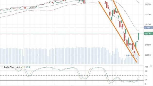 В четверг, 26 марта, ключевые фондовые индексы Соединенных Штатов Америки завершили торги на положительной территории на фоне одобрения Сенатом законопроекта по поддержке экономики и граждан страны на $2 триллиона. За его принятие проголосовали все 96 сенаторов, и теперь документ будет рассмотрен Палатой представителей, после чего отправится на подпись президенту Дональду Трампу. По словам министра финансов США Стивена Мнучина, данный законопроект, предусматривающий увеличение пособий по безработице, единовременные выплаты гражданам, запуск программы поддержки малого бизнеса, а также выделение средств для финансирования различных отраслей, городов и штатов, сохранит экономику на плаву в течение трех месяцев. Дополнительную поддержку оказали заявления главы ФРС Джерома Пауэлла, который заверил, что у американского регулятора есть пространство для дальнейших действий. По словам главы ФРС, американская экономика, возможно, уже столкнулась с рецессией, однако экономическая активность, скорее всего, восстановится во второй половине 2020 года. Оптимистичный настрой не смогли испортить шокирующие данные по рынку труда. Заметим, что количество первичных обращений за пособиями по безработице составило на минувшей неделе 3,283 млн (рекордное значение с начала учета данных в 1967 году), тогда как аналитики прогнозировали 1 млн. По итогам сессии индикатор "голубых фишек" Dow Jones Industrial Average увеличился на 6,38% до отметки в 22552,17 пункта, индекс широкого рынка S&P 500 ушел в плюс на 6,24% до 2630,07 пункта, а индекс высокотехнологичных компаний Nasdaq продвинулся на 5,60% и закрылся на уровне 7797,54 пункта. Фьючерсы на нефть марки Light с поставкой в мае по итогам торгов на NYMEX подешевели на $1,89 до уровня в $22,60 за баррель. По итогам торгов на COMEX цена на фьючерсы на золото с поставкой в апреле подросла на $17,80 до отметки в $1651,20 за тройскую унцию. Доходность десятилетних казначейских облигаций составила, в свою очередь, 0,81%. В составе индекса "голубых фишек" лишь акции компании Dow закрылись в "красной" зоне, отступив на 2,3%, а наибольший рост продемонстрировали бумаги Boeing, Chevron, Walgreens и UnitedHealth Group, подорожавшие на 13,75%, 10,26%, 10,21% и 8,91% соответственно. Тем временем, акции производителя оборудования для дорожного строительства и горнодобывающей промышленности Caterpillar ушли в плюс на 6,06%, несмотря на заявления о временном прекращении работы ряда его предприятий. Кроме того, компания отозвала свои прогнозы на текущий год. Неудачно сложилась сессия для автопроизводителя Ford Motor, убавившего из своего актива 2,5% ввиду понижения его долгосрочного кредитного рейтинга агентством S&P сразу на две ступени до уровня "ВВ+". S&P 500 На дневном графике индекс S&P 500, пробив верхнюю границу "нисходящего клина", продолжил восходящее движение, тогда как медленные стохастические линии и индикатор RSI находятся в благоприятном для покупки положении. Учитывая вышесказанное, в краткосрочной перспективе не исключается дальнейший рост индекса. График
