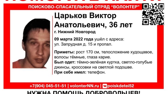 36-летний Виктор Царьков пропал в Нижнем Новгороде, сообщается в группе ПСО «Волонтер НН» в сети «ВКонтакте».