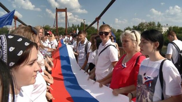В День российского триколора самый большой флаг растянули на мосту Дружбы. Полотно протяженностью 120 метров заняло более половины переправы - это масштабный флешмоб в честь праздника. Участники творческих коллективов Пензы и студенты высших и средних образовательных учреждений под палящим солнцем держали огромный бело-сине-красный флаг.