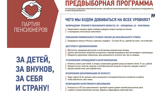 Предвыборная программа Регионального отделения Политической Партии «Российская партия пенсионеров за социальную справедливость» в Нижегородской области. Чего мы будем добиваться на всех уровнях? Возвращения прежнего пенсионного возраста : 55 — женщинам, 60 — мужчинам. — Предоставить каждому право свободно выбирать возраст выхода на пенсию и наследовать пенсионные накопления. Повышения минимального размера пенсии до максимального уровня. — Приведение пенсии в России к единому стандарту — не ниже 30 тыс. рублей (не ниже, чем в Москве). Доступного здравоохранения. — Обеспечить гражданам доступную и качественную медицинскую помощь независимо от региона проживания. Сделать бесплатными лекарства по рецептам и зубопротезирование для пенсионеров и малоимущих. Прекратить укрупнение поликлиник, дать возможность лечиться там, где ты живешь. Установления справедливого налогообложения. — Отменить налоги для семей, в которых совокупный душевой доход составляет менее 15 тыс. рублей. Прекратить рост налогов, акцизов и иной фискальной нагрузки на простых граждан и ввести прогрессивный налог для сверхбогатых. Искоренения дискриминации по возрасту. — Люди старше 40 лет должны иметь возможность беспрепятственного устройства на работу, чтобы обеспечить свои семьи. Возвращения качественного образования. — Отказаться от ЕГЭ, как единственного критерия оценки уровня знаний выпускников школ и выйти из блока Болонской системы. Вернуть в образование советский опыт .