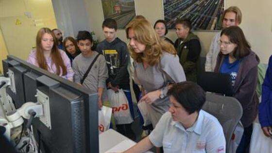 Ребят из разных школ от 7-го до 11-го класса пригласили в центр управления железнодорожными перевозками. Сразу на входе их встретили, как важных гостей и даже подарили сувениры, а дальше - экскурсия по всем этажам.