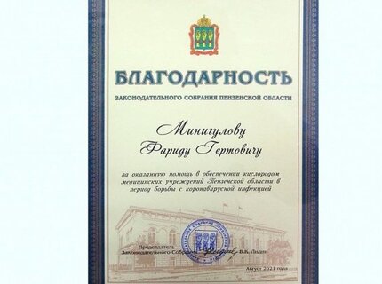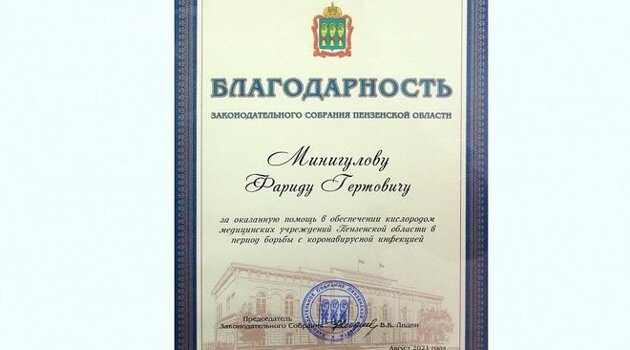 Генеральному директору ПАО "Казаньоргсинтез" вручена благодарность парламента Пензенской области