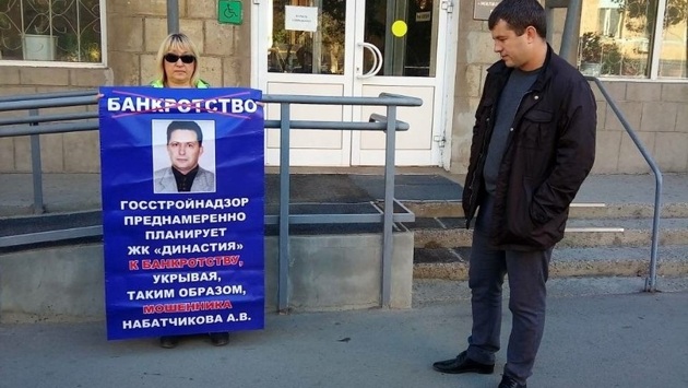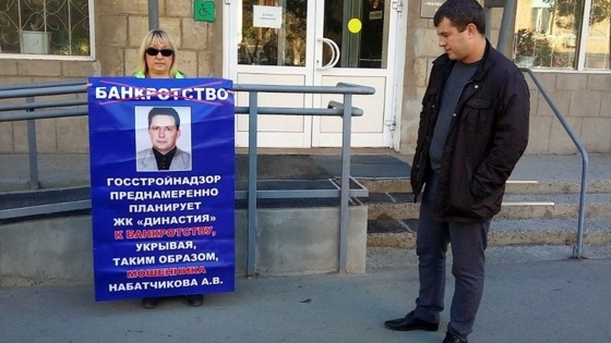 В Госстройнадзоре Роман Касьянов обнадёжить вкладчиков не сумел Возле здания госстройнадзора Волгоградской области вкладчики ЖК «Династия» провели очередную серию одиночных пикетов, с требованием возобновить замороженную стройку на улице Огарева, 21б и привлечь к уголовной ответственности нерадивого застройщика, обещавшего горожанам возвести высотку ещё несколько лет назад. Дольщики намерены ехать в Москву, где привлечь внимание федеральных властей к своей проблеме. — Во время одиночного пикета у госстройнадзора к нам вышел заместитель председателя инспекции Роман Касьянов, — рассказала V1.ru дольщица Марина Тесленко. — Он сообщил, что один из застройщиков некто г-н Тозик со всеми документами о строительстве задержан в Белоруссии за финансовые преступления. Но директора ООО «Стройснаб» к ответственности за вывод квартир и заморозку стройки никто не привлекает. Вкладчики ЖК «Династия» через московских журналистов намерены достучаться до власти Волгоградцам предложили попытаться продать часть помещений в недоделанной высотки, чтобы выручить средства на дальнейшее строительство. — Первые два этажа высотки, где по проекту должен был быть детский садик хотят перевести в жилые помещения и продать под квартиры и офисы, — говорит Марина Тесленко. — Этих денег хватит вставить оставшиеся 20 пластиковых окон и сделать крышу. А дальше никаких перспектив. Отчаявшись бороться за свои кровные вкладчики в конце октября поедут с пикетами в столицу. — 29 октября мы выйдем с одиночными пикетами вначале у Минстроя РФ, а затем у Государственной Думы, — пояснили дольщики ЖК «Династия». — Мы также записались на приём в МВД и Генеральной прокуратуре, где расскажем, как при полном попустительстве волгоградских надзорных органов и администрации, застройщик выводил наши деньги со стройки, а сейчас собирается обанкротиться. Деваться нам уже всё равно некуда. А вся эта история попахивает коррупцией и большой ложью. Три недели назад дольщики ЖК «Династия» провели массовый пикет на площади Ленина. В начале сентября они устроили серии одиночных пикетов напротив администрации региона. Глава Госстройнадзора Александр Сторожук упрекнул вкладчиков за недальновидность и вложение своих средств в долевое строительство. У здания Госстройнадзора дольщики уже протестовали, но с ними общаться из чиновников никто не захотел. В конце июля вкладчики запустили в воздух «змейку Путина» во время митинга у «Царицынской оперы». Волгоградцы распечатали фотографии ответственных за стройку чиновников и застройщика, демонстративно их разорвали и выкинули в мусорное ведро, сопровождая свои действия не самыми лучшими пожеланиями. Часть фотографий волгоградцы привязали к связке чёрных гелиевых шаров и запустили в воздух. Летом вкладчики возводящейся высотки на Огарева, 21б намеревались разбить палаточный лагерь на территории стройки, но им не позволили этого сделать городские чиновники и полиция. Входные ворота на площадку были закрыты.