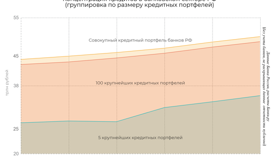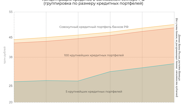 Совокупный кредитный портфель российских банков, раскрывающих свою отчетность, в августе 2018 года увеличился на 962,6 млрд рублей, или на 1,96%, и на отчетную дату составил 50,1 трлн рублей. Об этом свидетельствуют данные финансового рейтинга Банки.ру. С начала года сумма выданных кредитов выросла на 8,9%, или на 4,1 трлн рублей, а за 12 месяцев, прошедших с 1 сентября 2017 года, — на 13,2%, или на 5,8 трлн рублей. При этом пять крупнейших кредитных портфелей на рынке только с начала года прибавили более 5,7 трлн рублей, а за 12 месяцев — почти 7 трлн. Лидером роста в очередной раз стал кредитный портфель Сбербанка (рост в августе на 433,4 млрд рублей, или на 2,4%), в основном за счет кредитов, выданных как юрлицам, так и физлицам, на срок свыше трех лет. Лидером по сокращению кредитного портфеля оказался «Российский Капитал» (минус 8,7%, или минус 11,3 млрд рублей за счет корпоративных кредитов). Доля пяти крупнейших кредитных портфелей в общей массе увеличилась за 12 месяцев с 63,1% до 69,7%. Доля 100 крупнейших кредитных портфелей за тот же период в общем объеме изменилась менее существенно — с 97,1% до 97,4% за 12 месяцев (на 1 января 2018 года этот показатель составлял 96,9%). Продуктовый виджет Корпоративный кредитный портфель банковского сектора в августе увеличился на 731,5 млрд рублей, или на 2,1%, с начала года — на 7,3%, или на 2,5 трлн рублей; за 12 месяцев (без учета банков, не раскрывавших отчетность) рост составил 3,5 трлн рублей, или 10,6%. Объем портфеля кредитов, выданных юрлицам пятью крупнейшими корпоративными кредиторами, вырос за месяц на 3,7%, с начала года — на 12,6%, за год — на 17,1% (в денежном выражении — на 909,4 млрд, 2,9 трлн и на 3,7 трлн рублей соответственно). Среди лидеров по динамике роста в августе только крупнейшие банки из топ-10 по активам — три госбанка, а также Альфа-Банк и Московский Кредитный Банк. По данным опроса ЦБ среди 100 крупнейших по величине активов банков, по итогам 2018 года темп прироста корпоративного кредитного портфеля этих банков составит около 7%. 219 банков показали отрицательную динамику корпоративного кредитного портфеля в прошедшем месяце, у 41 из них сокращение превысило 10%. Промсвязьбанк, в прошлом месяце занимавший десятое место по размеру портфеля корпоративных кредитов, не раскрыл отчетность на 1 сентября. Крупнейшее сокращение корпоративного кредитного портфеля в августе показал «Российский Капитал» (на 13,4 млрд рублей или на 15,2%). Банк продолжает снижать уровень кредитного портфеля в текущем году. Совокупный розничный кредитный портфель российских банков, согласно данным финансового рейтинга Банки.ру, в августе вырос на 1,7%, или на 231,1 млрд рублей. С начала года рост составил 13,3%, или 1,62 трлн рублей, а за 12 месяцев, без учета банков, не раскрывавших отчетность, — 20,8%, или 2,38 трлн рублей. По данным ЦБ, наиболее значительный прирост в розничном кредитовании с начала года приходится на ипотечные кредиты, но рост розничного портфеля в 2018 году происходил и за счет необеспеченных потребительских ссуд, а также автокредитов. Объем портфеля кредитов, выданных физическим лицам пятью крупнейшими розничными кредиторами, вырос за месяц на 2,6%, с начала года — на 20,9%, за 12 месяцев — на 28,9% (в денежном выражении — на 241,5 млрд, 1,62 трлн и на 2,1 трлн рублей соответственно). 243 банка показали положительную динамику розничного кредитного портфеля в августе, у 30 из них рост за мес