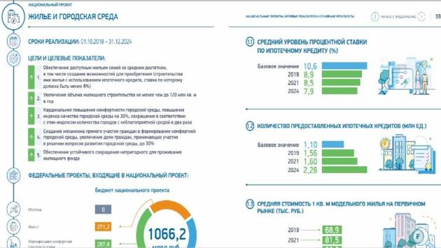 Таковы плановые показатели нацпроекта «Жилье и городская среда». Количество ДДУ без использования счетов эскроу к этому сроку должно сойти на нет. При этом количество договоров с использованием счетов эскроу-счетов должно вырасти с ожидаемых 34 тыс. в конце 2019-го до более 1 млн в 2024 году. Источник: Правительство РФ На сайте Правительства РФ опубликованы в виде инфографики материалы о национальных проектах по 12 направлениям стратегического развития, установленным Указом Президента России от 7 мая 2018 года №204. Тем самым заявлены окончательные официальные плановые показатели по нацпроекту «Жилье и городская среда». Фото: www.news.sarbc.ru В соответствии с этими индикаторами данный нацпроект со сроком реализации в 2019—2024 годах и совокупным объемом финансирования (за счет средств федерального бюджета, региональных бюджетов и внебюджетных источников) в размере 1,066 трлн руб. предполагает: • объем жилищного строительства: - по итогам 2019 года — 88 млн кв. м; - по итогам 2021 года — 94 млн кв. м; - по итогам 2024 года — 120 млн кв. м. • объем ввода в многоквартирных жилых домах: - по итогам 2019 года — 54,8 млн кв. м; - по итогам 2021 года — 60 млн кв. м; - по итогам 2024 года — 80 млн кв. м; • средний уровень ставки ИЖК: - по итогам 2019 года — 8,9% годовых; - по итогам 2021 года — 8,5% годовых; - по итогам 2024 года — 7,9% годовых; • среднюю стоимость 1 кв. м жилья: - по итогам 2019 года — 68,9 тыс. руб.; - по итогам 2021 года — 81,5 тыс. руб.; - по итогам 2024 года — 88 тыс. руб; • количество действующих договоров долевого участия (ДДУ) по счетам эскроу: - по итогам 2019 года — 34 тыс.; - по итогам 2021 года — 635 тыс.; - по итогам 2024 года — более 1 млн. Фото: www.floridagreenhomebroker.com К слову, в соответствии с нацпроектом «Жилье и городская среда», к 2024 году планируется свести на нет число ДДУ, заключенных без размещения средств дольщиков на счетах эскроу. Фото: www.dpo-ilm.ru