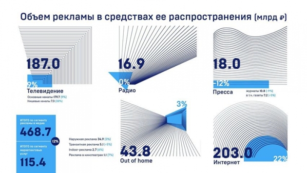 На пресс-конференции в ТАСС Ассоциация Коммуникационных Агентств России предоставила итоги развития рекламного рынка России за 2018 год. Российский рынок третий год подряд демонстрирует двузначную динамику. Рост отечественного рекламного рынка в 2018 году по-прежнему остается впечатляющим и одним из самых высоких в Европе. Суммарный объем рекламы в средствах ее распространения за вычетом НДС составил почти 469 млрд рублей, что на 12% больше, чем в 2017 году. В 2018 году интернет впервые стал самым крупным медиа сегментом российского рекламного рынка, оттеснив на второе место телевидение. При этом интернет продолжает оставаться наиболее динамично растущим сегментом. Объем рынка интернет-рекламы вырос на 22% и составил 203 млрд рублей, динамика сегмента ТВ превысила 9%, что позволило достичь уровня объема в 187 млрд рублей. Сергей Веселов, Вице-президент АКАР, Сопредседатель Комиссии экспертов АКАР, Директор по маркетинговым исследованиям Аналитического центра НСК: "С одной стороны, 2018 год показал отличную динамику, в очередной раз превысив отметку роста в 10% – любой рынок мира может только позавидовать такому показателю. Но с другой, прямо скажем, год выдался для рекламной индустрии не простым. Начало года было очень удачным, затем динамика несколько снизилась, а в последнем квартале в отдельных сегментах она стала даже отрицательной. При этом лишь два основных сегмента – интернет и телевидение – имеют высокую положительную динамику, у остальных она либо близка к нулю, либо находится в отрицательной зоне." Алексей Беляев, Председатель индустриального комитета по исследованиям IAB Russia: В этом году Комиссия экспертов АКАР на ряду с традиционным подходом к оценке объемов рынка по медиа сегментам впервые применила новую методику оценки – по типу контента, оценив объемы рекламы, собираемые при распространении аудио-, видео- и издательского контента, как в традиционной, так и в digital-среде. Полученные результаты показывают, что наиболее динамично развивающимися являются те компании из "традиционных" медиа сегментов (телевидение, радио, газеты и журналы), которые активно работают и в цифровой среде. Объем сегмента маркетинговых услуг составил 115,4 млрд рублей, то есть на 12% больше, чем в 2017 году. С учетом рекламных бюджетов, израсходованных на создание креативных решений, на производство рекламной продукции и на оплату услуг рекламных агентств суммарный объем российского рынка маркетинговых коммуникаций составил примерно 810-830 млрд рублей. Татьяна Щербакова, Президент РАМУ, Сопредседатель комитета по маркетинговым услугам АКАР, Президент ARK Group: "Эксперты РАМУ подвели итоги деятельности рынка маркетинговых услуг за 2018 год. Отрадно отметить, что рынок маркетинговых услуг не только показал 12% рост, достигнув 115 млрд рублей, но и превысил экспертные ожидания. Все сегменты рынка показали позитивный тренд в той или иной степени. Основными драйверами роста были активности брендов на чемпионате мира по футболу и увеличение бюджетов на маркетинговые услуги, как одну из наиболее ключевых и эффективных коммуникаций с потребителем." Реклама в печатных СМИ показывает в среднем заметную отрицательную динамику (-12%) что составляет 18 млрд рублей. Но центральный подсегмент прессы и ведущие издательские дома намного более успешны, а доходы диджитал ресурсо