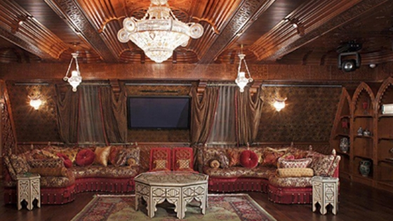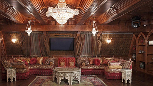 Все люстры в комнатах выполнены из хрусталя, стены — из красного дерева. Также есть инкрустированный камин и ванна на подиуме из медового оникса.