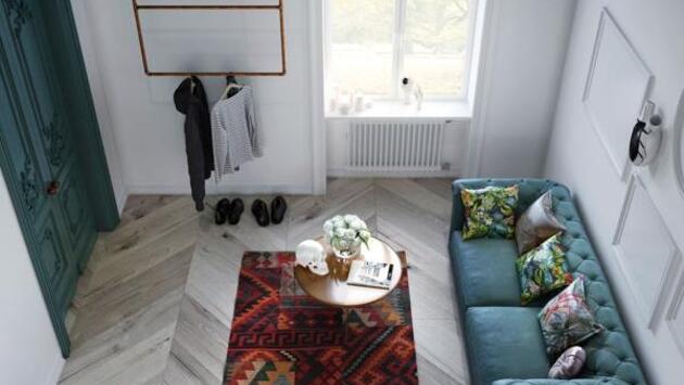 Выбор пал на один самых модных оттенков — цвет Kale, который ещё называют цветом кудрявой капусты. Для равновесия этот же цвет частично используется в ванной и гостиной. А чтобы интерьер не казался мрачным, его разбавили аксессуарами тёплых насыщенных оттенков с картин Босха. Так появились декоративные подушки и ковёр с этническим принтом. Все детали в интерьере перекликаются между собой, благодаря чему он выглядит таким цельным и законченным.