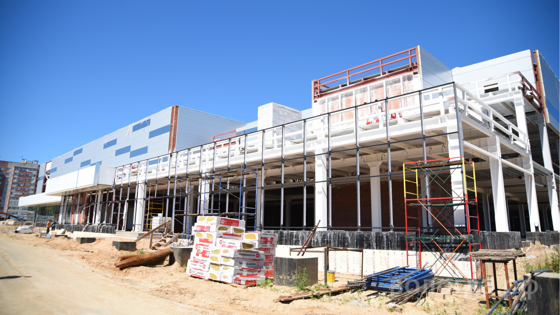 В микрорайоне Бывалово продолжается строительство нового ледового дворца. Строители завершают работы по облицовке здания стеновыми сэндвич-панелями и обустройству кровли.