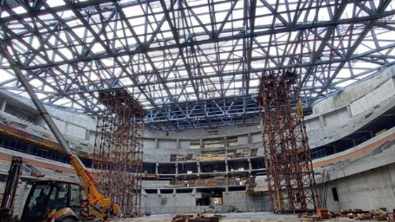 Кровля будет состоять и металлических панелей, устойчивых к коррозии и истиранию. Сейчас подрядчик ООО «ЭлинАльфа» укладывает утеплитель. Планируется сначала сделать кровлю на малых аренах, а потом заняться основной.