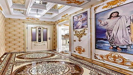 По словам курировавшей сделку риелтора, над ремонтом работали профессиональные дизайнеры, и все детали интерьера выполнены из дорогих материалов. Межкомнатные двери и мебель сделаны из массива, а в санузле стоит позолоченный унитаз. Одной из особенностей квартиры эксперт назвала фрески — прихожую украшает идущий по воде Иисус Христос, а в столовой разместили репродукцию картины «Тайная вечеря».