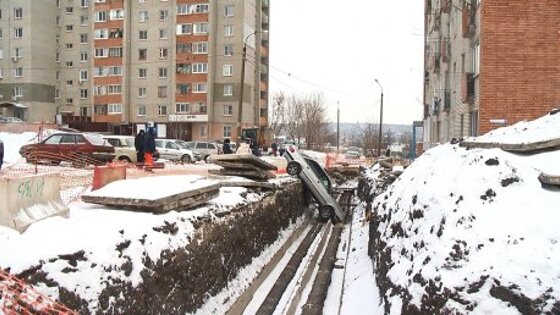 Утром житель дома на Минской, 24, собирался прогреть Audi и совершенно не ожидал ее побега прямо из-под носа. В мгновение ока иномарка скатилась в траншею и уткнулась в трубы.