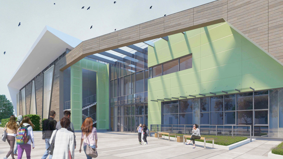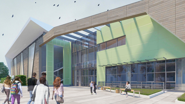 Фасады отделают алюминиевыми панелями гармонирующих между собой природных оттенков: древесного, светло-зеленого, бежевого и светло-серого. Также внешнюю отделку дополнят витражным остеклением.
