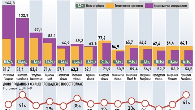 На более длинных временных отрезках можно проследить некоторое расхождение между предложением и спросом на рынке жилья. С весны прошлого года до начала зимы постепенно росло количество непроданных квартир в новостройках. Так, в апреле прошлого года купили 41 квартиру из 100 в домах, которые находились в процессе строительства. В декабре -лишь 28. Последние данные корпорации ДОМ.РФ на середину апреля текущего года: реализовано 29 процентов квартир.