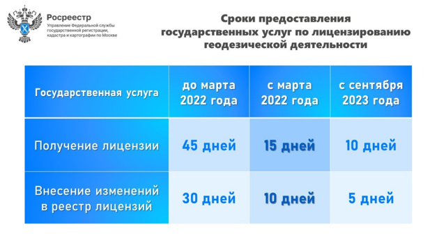 В настоящее время на территории города Москвы 225 компаний осуществляют геодезическую и картографическую деятельность. Их перечень опубликован в актуальном реестре, размещенном на официальном сайте Росреестра. За 2023 год Управлением Росреестра по Москве принято 40 заявлений на выдачу лицензий, и на внесение изменений в реестр. «В 2022 году, благодаря совершенствованию сервисов и переводу услуг Росреестра в электронный вид соискателям стало значительно проще и удобнее подавать заявления на лицензирование геодезической и картографической деятельности. Срок рассмотрения заявлений сократился в 3 раза. В настоящий момент 15 рабочих дней требуется для ее получения и 10 дней – на внесение изменений в реестр. С сентября 2023 года сроки будут дополнительно сокращены и составят 10 и 5 дней соответственно», — отметил Александр Левченков, заместитель руководителя Управления Росреестра по Москве. Для получения лицензии необходимо подать заявление через федеральную государственную информационную систему «Единый портал государственных и муниципальных услуг». Лицензиату не требуется прикладывать копии документов, подтверждающих наличие у него технических средств и оборудования, документы об организации производственного контроля за соблюдением требований к выполнению геодезических и картографических работ и их результатам. При необходимости сотрудники Управления самостоятельно запрашивают сведения в различных информационных системах органов власти, к примеру, в Рособрнадзоре, Росстандарте и Социальном фонде России. Также до конца 2023 года не требуется оплата государственных пошлин в рамках оказания государственных услуг по лицензированию. Пресс-служба Росреестра по Москве