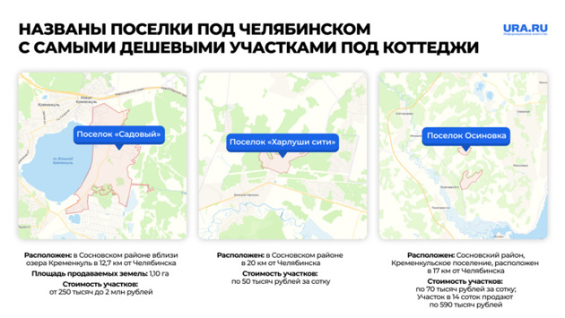 «Земельные участки под коттеджи под Челябинском вот уже на протяжении трех лет очень хорошо раскупаются и также быстро растут в цене. В ноябре 2023 года недорогие участки продаются в поселке „Харлуши сити“. Поселение находится в Сосновском районе в 20 км от Челябинска, участки продаются по 50 тысяч рублей за сотку. Немного дороже по стоимости выйдут участки в коттеджных поселках „Осиновка“ и „Садовый“», — сообщил URA.RU Медведев.