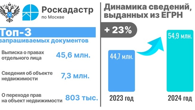 За 6 месяцев 2024 года в Москве выдано свыше 54,9 млн выписок из Единого государственного реестра недвижимости (ЕГРН). Об этом сообщил руководитель Управления Росреестра по Москве Игорь Майданов. «К первому полугодию 2023 года показатель увеличился на 10 млн выписок. Такой рост во многом обусловлен переходом на электронный формат предоставления услуг, при котором выписку из госреестра недвижимости можно получить за несколько минут на сайте ЕПГУ. Кроме того, отмечается снижение количества сведений, выданных в бумажном виде: за 6 месяцев их насчитывается менее 0,2% – 112 тысяч из почти 55 млн выписок», — рассказал Игорь Майданов. За первое полугодие текущего года наиболее популярными документами для получения в Москве стали: выписки о правах отдельного лица – выдано более 45,6 млн. сведений, об объекте недвижимости – 7,3 млн., о переходе прав на объект недвижимости – 803 тыс. «Статистика выдачи сведений из ЕГРН демонстрирует высокую популярность услуги среди граждан столицы. Общее количество предоставленных выписок за 1 полугодие 2024 года достигло рекордной отметки и увеличилось на 23% по сравнению с аналогичными показателями прошлого года. При этом, электронный формат получения документов является наиболее востребованным, доля которого составила более 99% от общего объема представленной информации», – отметила директор филиала ППК «Роскадастр» по Москве Елена Спиридонова. Напомним, чтобы получить выписку из ЕГРН, содержащую персональные данные владельца объекта недвижимости, перед проведением сделки собственнику необходимо подать заявление об открытии персональных данных в ЕГРН. Сделать это можно лично в Центрах государственных услуг «Мои документы» или в электронной форме через личный кабинет на сайте Росреестра. Запись об открытии персональных данных вносится в ЕГРН в срок не более трех рабочих дней с момента поступления заявления. Погасить запись в ЕГРН о возможности предоставления персональных данных можно, подав аналогичное заявление. Получить общедоступные сведения из ЕГРН в электронном виде может любое заинтересованное лицо, воспользовавшись сервисами Росреестра и Роскадастра, либо Единым порталом государственных и муниципальных услуг.